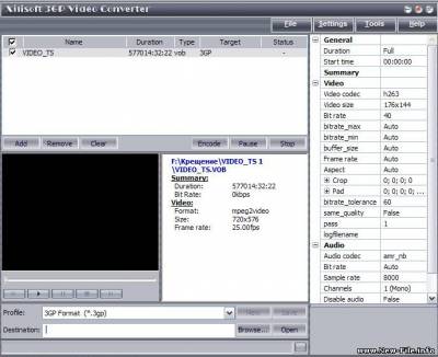 Описание: Xilisoft 3GP Video Converter 2.1.40 - является конвертером 3GP видео файлов в другие видео форматы, извлечение аудио. Особенности: конвертер MPG, MPEG1, MPEG2, MPEG4, WMV, MP4, 3GP, MOV, RM, DV, YUV, H264 в 3GPP формат, конвертер 3GP в MPEG, AVI, VOB, MPEG4, WMV и другие форматы, извлечение аудио из 3GP видео в MP2, MP3, AC3, RA, M4A форматы, конвертер MP3, WAV, AC3, WMA, M4A, OGG, AAC в audio 3GP (только аудио), пакетный режим конвертирования, выбор и настройка аудио и видео кодеков, настройка параметров конвертирования для каждого файла или папки, предварительный просмотр в встроенном проигрывателе, простой и удобный интерфейс.